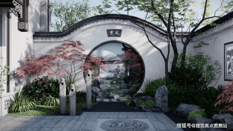 承袭传统江南园林造园精髓,精研恢弘照壁(朴注:照壁,古称萧墙,是中国传统建筑中用于遮挡视线的墙壁,位置一般在一组建筑群的大门外或大门内。)、九脊歇山顶(朴注:一条正脊、四条垂脊和四条戗脊)、飞檐斗拱、巨幕框景(朴注:利用门框、窗框、树框、山洞等,有选择地摄取空间的优美景色,形成如嵌入镜框中图画的造景方式。)、叠山理石、理水入园、云渊华纹等七系古法技艺,营造具有中式情节的新苏式国学府园。