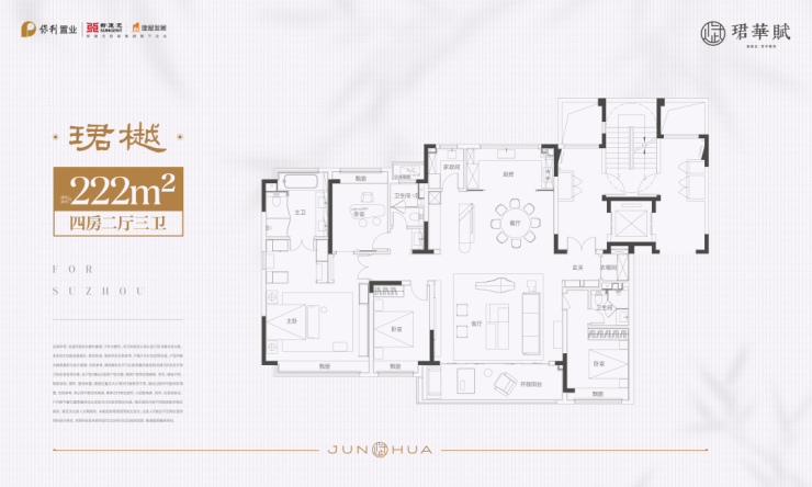 既然是高端改善,户型自然出众。保利珺华赋全部是150㎡起步的大户型,目前主力在售建面约152-222㎡的奢阔空间。户型设计经过精心打磨,尺度阔绰,功能分区科学,充分考虑了家庭生活的每一个场景,确保了居住的舒适度和私密性,是名副其实的大平层豪宅。