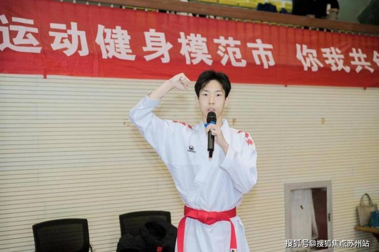 在正式比赛开始前,苏州市空手道队运动员为在场观众带来了精彩的动作演示,付海峰为在场观众讲解比赛规则。