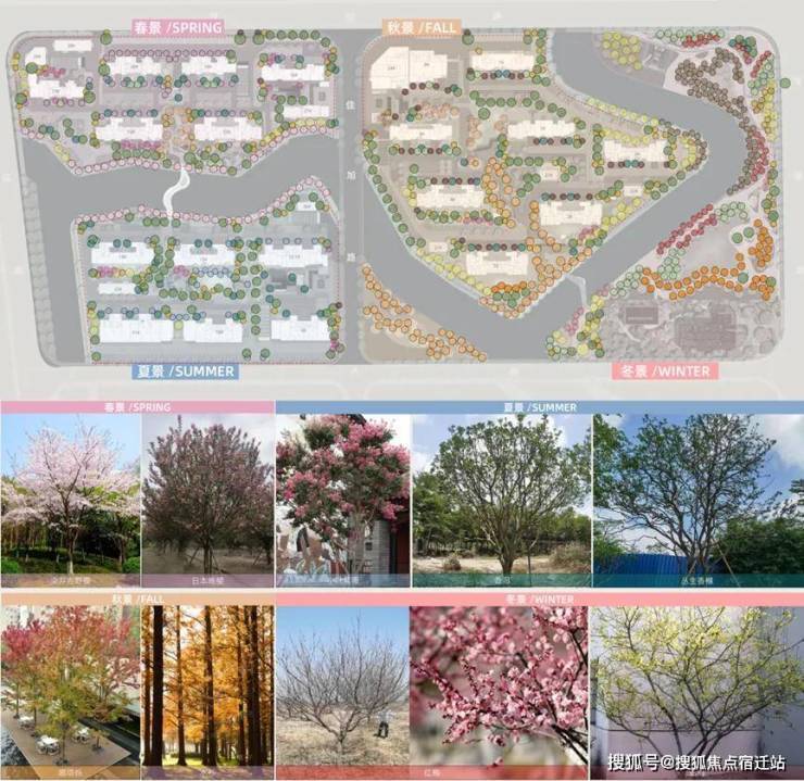 整个小区的景观规划为:春、夏、秋、冬四大主题,不仅在软硬景设计上贴合主题,还通过各季节代表性的植物进行补充、完善.不仅能够“移步易景”,甚至还能感受到“时移境迁”的别致体验.