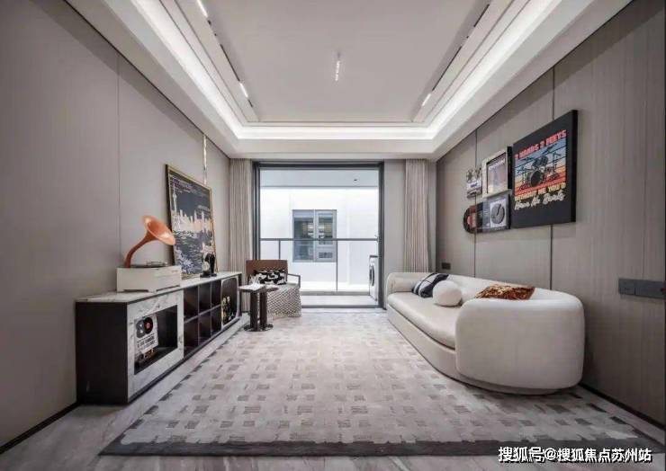 客厅约3.4m面宽,地面都是一体通铺的90*180大面砖,简洁清爽。