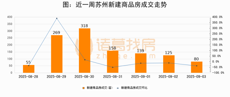 根据苏州市房地产市场和交易管理中心数据显示,2025年09月03日苏州新建商品房成交80套,较昨日减少45套,环比下降36%。近一周苏州新建商品房日均成交164套。09月03日单日成交80套,低于近一周平均水平51.2%。