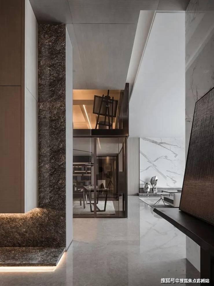云丝细腻、调性亲和的宝格丽棕大理石地面从玄关延伸至客厅和过道,稳重内敛,柔润的光泽使区域更为通透明亮。