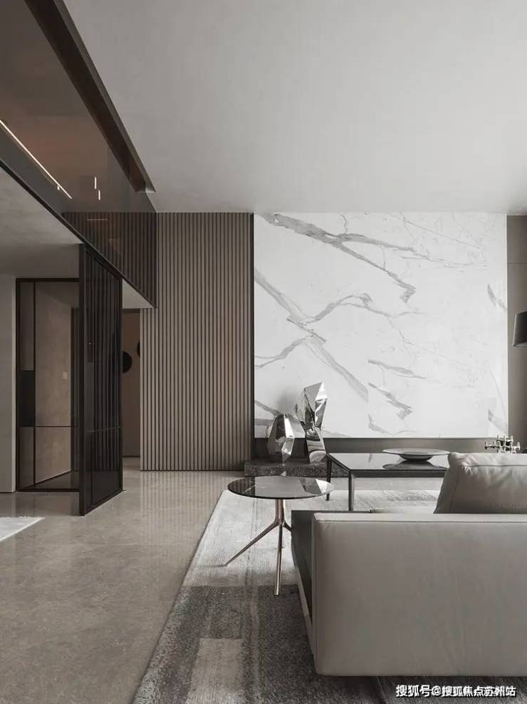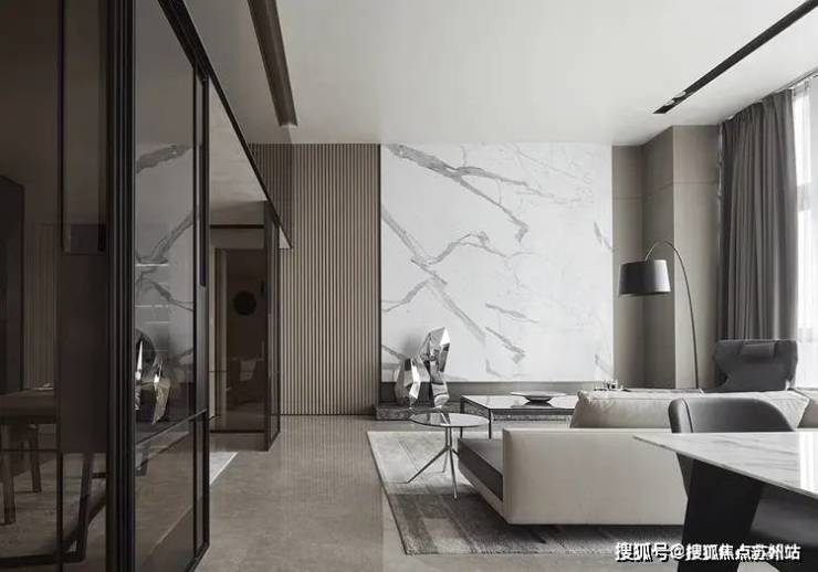 占据整体居所视觉重要的,是以鱼肚白大理石构成的客厅背景墙,线条明晰,行云流水,宛若破晓山涧,都市中突显的自然气息。