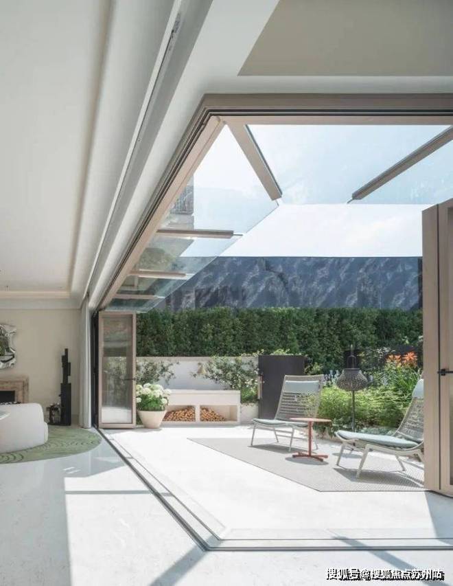 「无界空间」:客厅270度转角无柱设计,搭配落地玻璃,开阔视野将院中风景迎入日常。