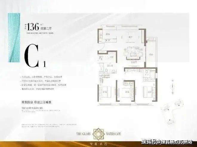 C1户型,建筑面积约136㎡四室二厅两卫,做到了三开间朝南+三卧室朝南且带飘窗+主卧套房设计+南北通透+动静分区,兼顾舒适度和尺度感的奢阔大4房。
