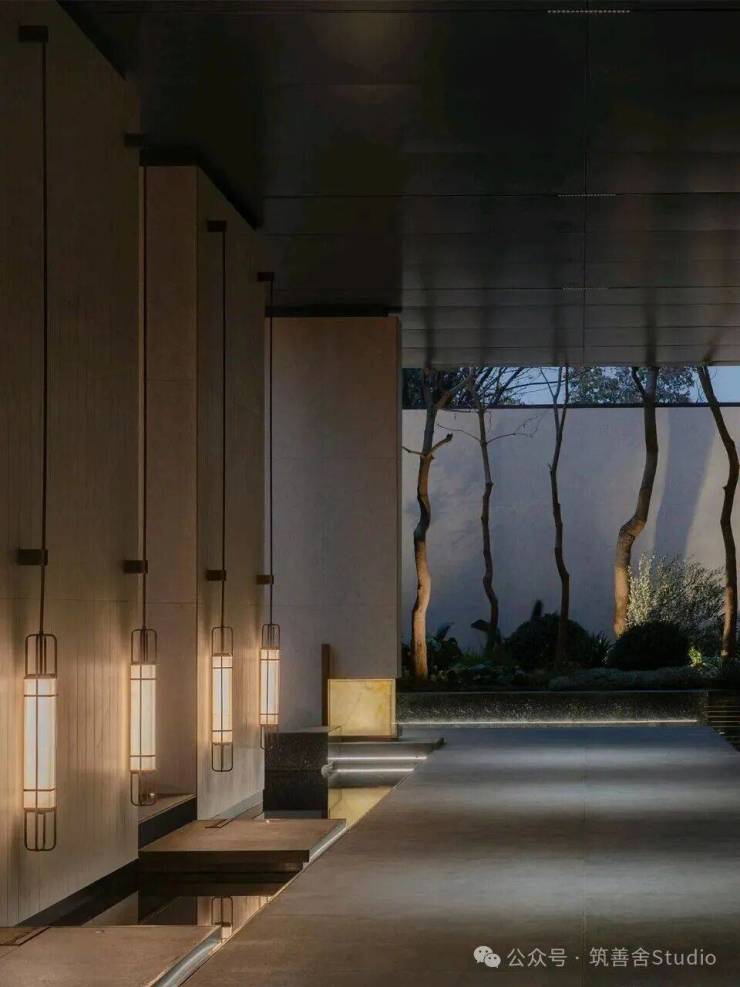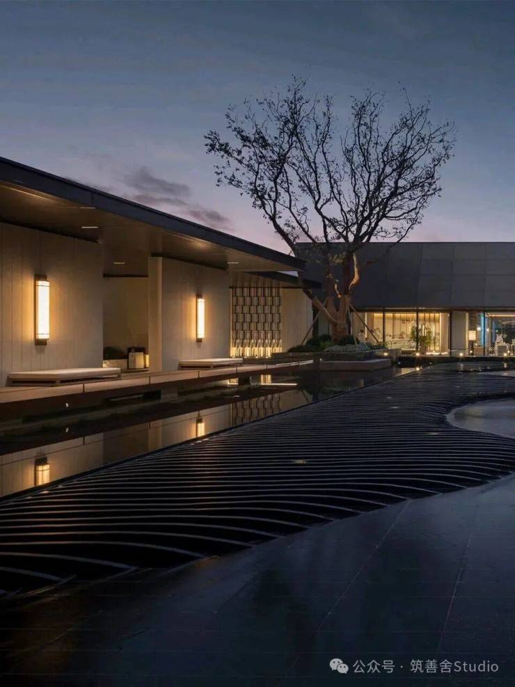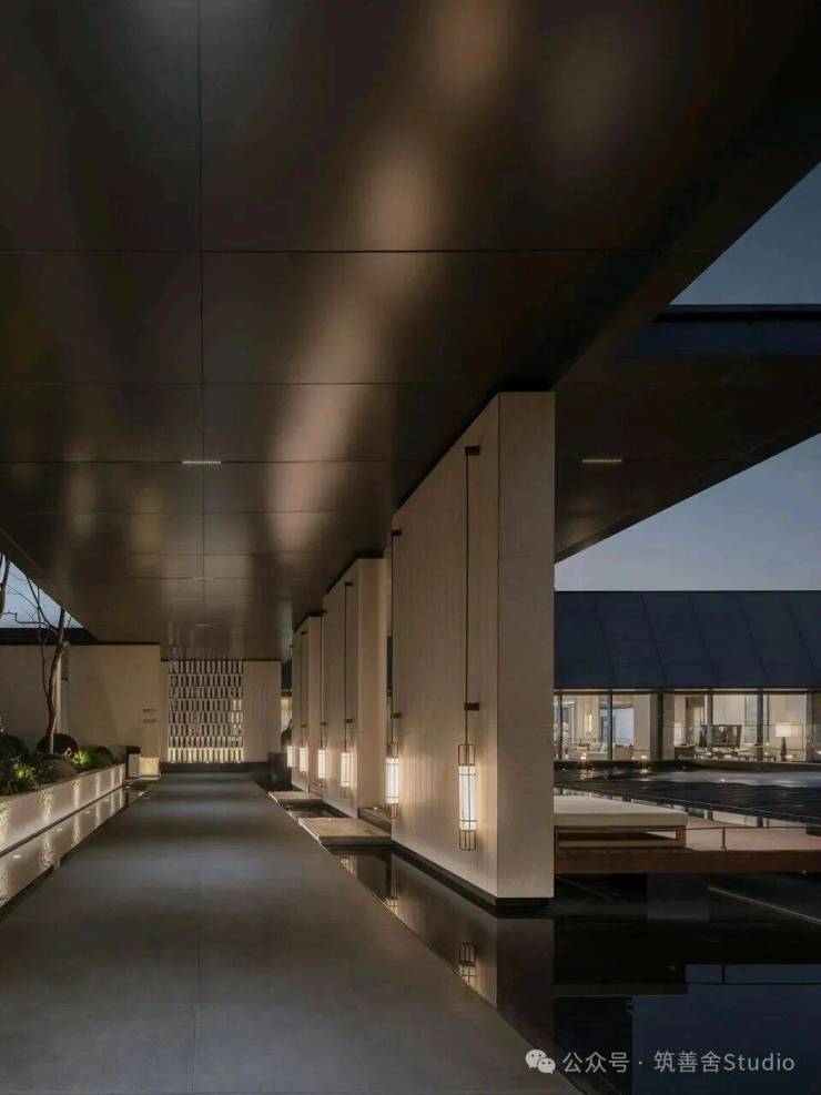 镜面水景倒映乌桕的树影,古铜色金属屏风如同漏窗演绎自然的光影艺术,酒店的静谧感碰撞逛苏园般的仪式感,宛如置身宋画之中。