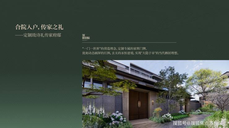 项目设计融合了姑苏书院的人文气息,用苏式园林的手法打造了一个让人向往自然山水的低密社区。整体南北分区造园,北边是洋房,南边是合院。归家的动线设计得很有仪式感,分为三进礼仪入园:一进是礼仪门厅,二进是天地院落,三进是生活雅院。在这三进之间,还巧妙地融入了九处充满诗意东方韵味的园景,打造出东方礼序的归家体验。