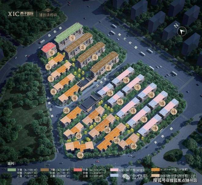 基于约1.1容积率的低密基因,遵循“南低北高、西低东高”建筑规划,创造性地采用“以湖为心、扇形铺展”的排布形式,规划3层合院、4层排屋、6层叠院,并以“L型半围合”排布,将5幢6层叠院沿城市道路布局,湖景资源最大化,打造「临湖而居,景城共生」的高端居住范式。