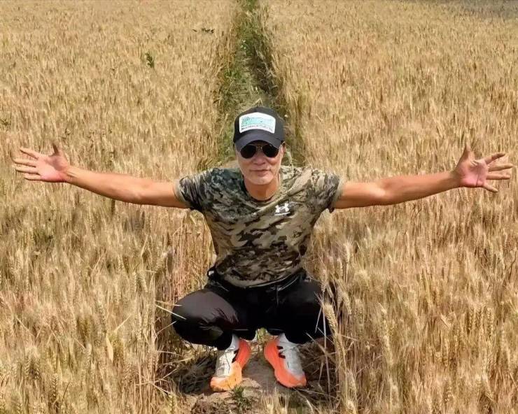 照片中,任达华上身穿着一件迷彩服,下身穿着一条黑色裤子,然后戴着墨镜和一顶黑色的帽子,穿着朴素像极了一位老农民,最显眼的应该也就是他那一双橙色的运动鞋了,与周围的黄色小麦和土地显得格格不入。