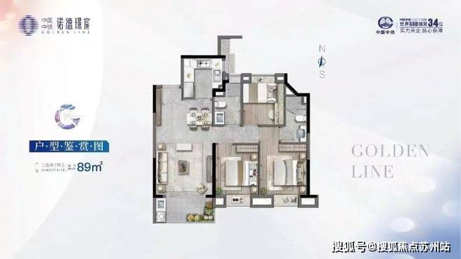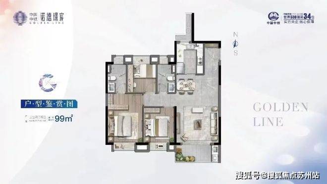 99㎡三房两卫:约6米大开间客厅,连接南向阳台,孩子玩耍空间充足;U型厨房高效收纳,主卧套房设计保障隐私;