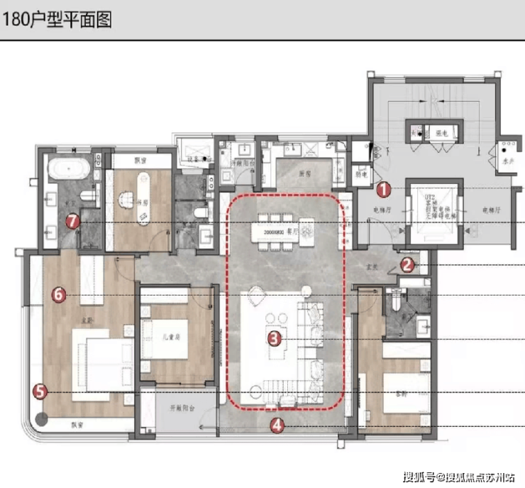 180平方米的大平层,四房两厅三卫设计,空间感十足,客厅开间达到6.6米,视野开阔,是改善型家庭的理想选择。