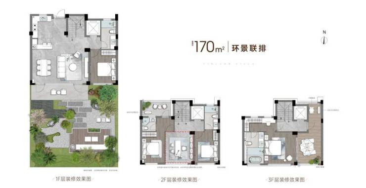 比如建面约280㎡的环景联排,客厅特别宽敞,还带大庭院和星空露台,气派十足。建面约215㎡的联排,三层空间功能分明,光是卧室就都是套房设计,私密性和舒适度拉满。即便是建面约170㎡的联排,也做到了“有天有地”,有院子、有露台,别墅该有的体验一样不少。无论是合院还是叠墅,都旨在提供一步到位的改善住宅选择。