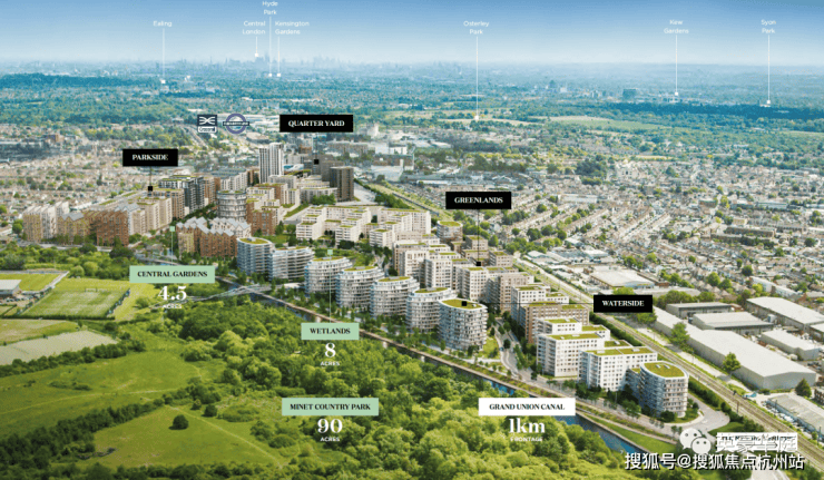 GreenQuarter项目由英国著名的开发商伯克利集团开发,属于大型住宅项目,主要分为4大区域,融合了3大中央花园,运河在临,为住户提供的绿意盎然的生活环境。