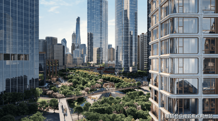 项目在内部打造中央草坪与社区云廊体系,与北外滩滨江中央公园、立体连廊呼应,形成一种与城市共生长的立体生活范本。
