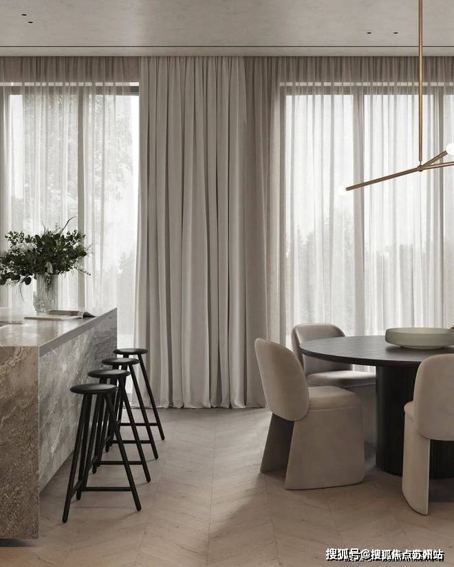 餐厅与厨房位于客厅的旁边,开放式的设计很好地利用了不大的公共空间,给人开阔的视觉感受.光线透过落地窗照入室内,让空间更加明亮.木质的圆形餐桌搭配上上方的金属吊灯,显得柔和而有质感.中岛台选用灰色大理石材质,与整体空间完美融合.