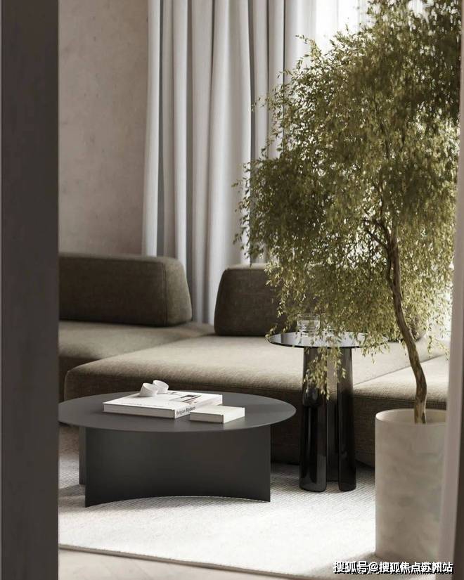 客厅中,设计师选用暖灰色作为空间的主色调,搭配上原木色的地板,奠定现代极简的空间基调.灰绿色的布艺沙发搭配上圆形的小茶几,展现出空间的几何美感.沙发旁摆放着绿植,为室内空间增添了一抹色彩,呈现出现代空间的生活美学.