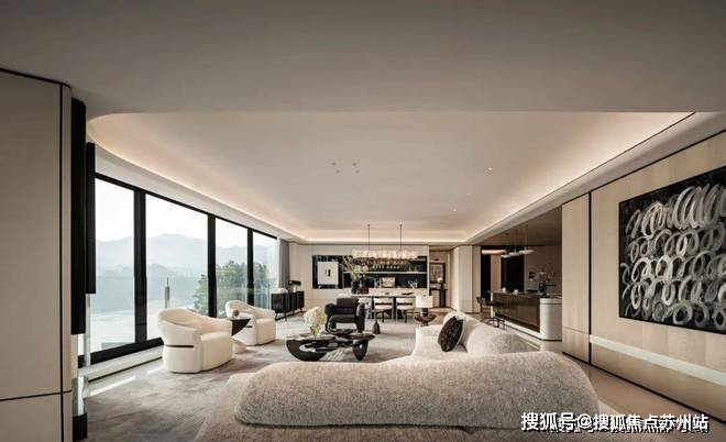 在这开阔而明媚的大平层空间里,270°的超大全景采光面如同一扇巨幅的画卷,将室外的绮丽景致无缝融入室内,让自然光线毫无拘束地自由穿梭。我们将沙发面向这无垠的窗景安置,让身心得以最大限度地沉浸在这份视觉盛宴之中。