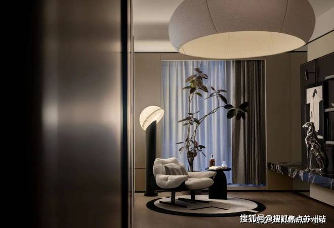 主卧以柔和的灰白色调为基底,陈设的点缀恰如其分。落地窗前,一张休闲椅与小圆几静静伫立,成为欣赏江景的美好角落。生活在此,成为一场永不落幕的风景。