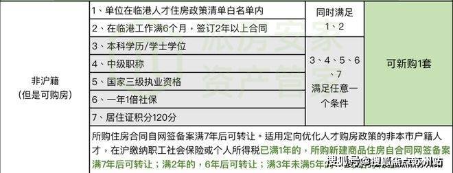 *按照区域发展和产业导向,经新片区管委会认定,同时符合以下单位条件(1、2)、个人条件(3、4、5、6、7)之一以及工作年限条件的非本市户籍人才,按规定在沪缴纳职工社会保险或个人所得税满1年及以上、且在本市无住房的,在新片区限购1套住房,同时购房资格由居民家庭调整为个人。