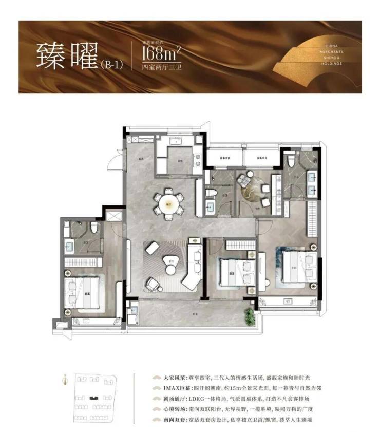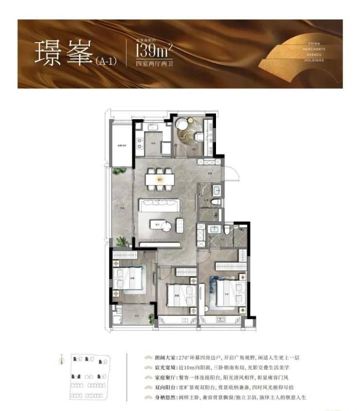 以中间套为例,建面约123㎡的户型做到了主次卧+客厅四开间朝南,伸展开约13.3米的超大面宽,对应双开间阳台与飘窗的设计,进一步提升了全屋的采光。此外,一体化的餐客厅,“一镜到底”活动空间,在视觉上拉大了户型的朗阔尺度。