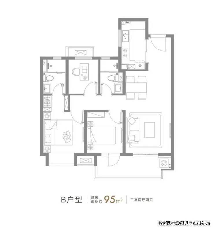 约95㎡的3房2厅2卫户型,这个户型的实用性太高了。能保证业主从二人世界到二胎家庭的全生命周期需求。