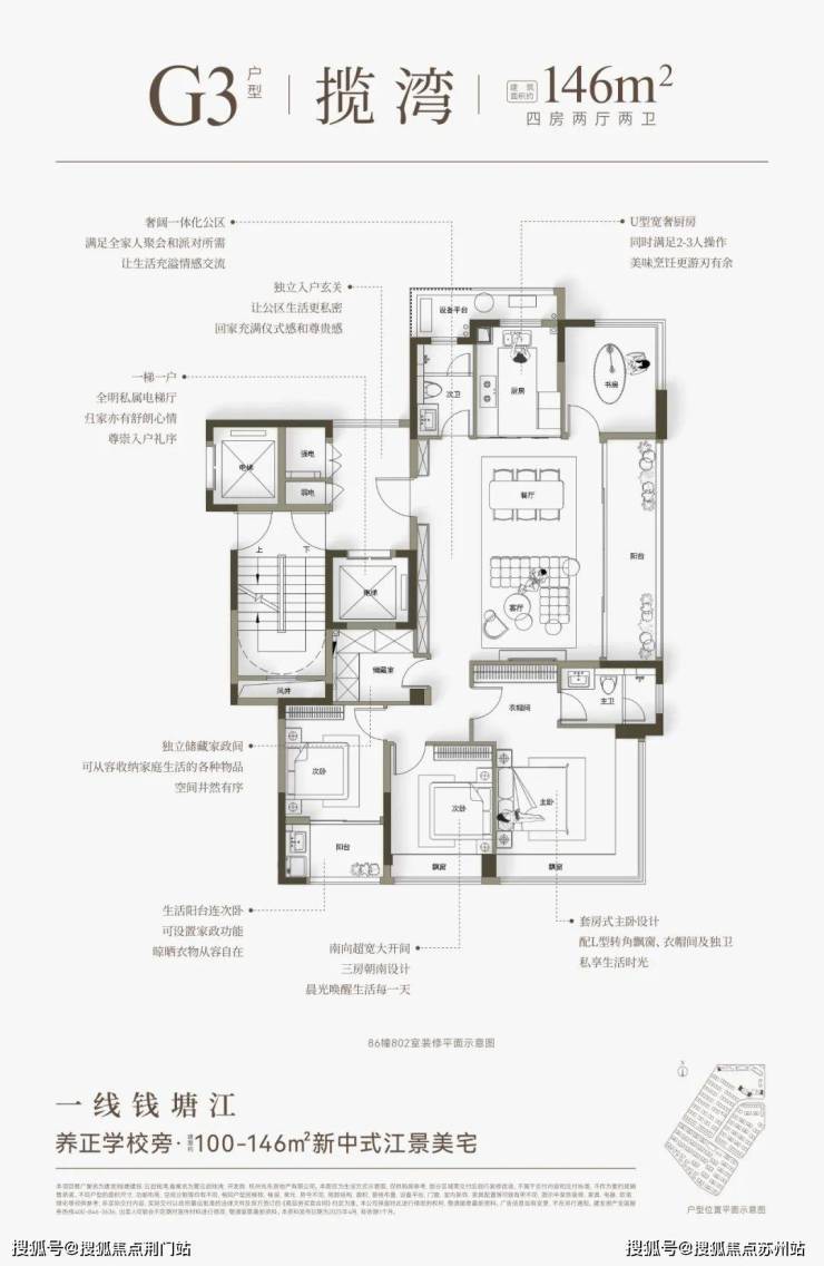 建面约146方则分为横竖两款,全部一线朝江。两梯两户,都有独立电梯厅。“横版”是四开间朝南+大方厅,“竖版”有大边厅+超长转角飘窗的“全景舱主卧”。