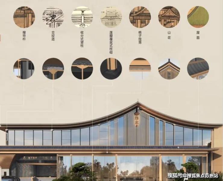 研习《营造法式》之精巧,提取宋朝代表性建筑中的中式重檐屋顶、木作构件元素,甄选铝板、石材、LOW-E玻璃为主材,打造简雅秀逸的宋风公建化立面。