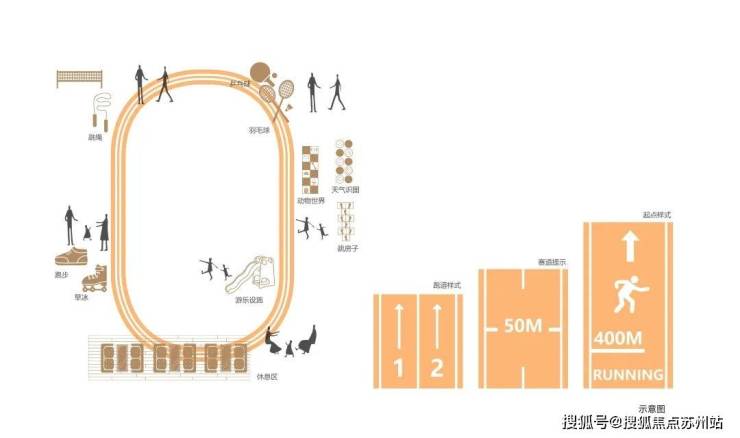 • 一体式健身跑道,设置跑道起跑方向、跑道标志指示,在跑道标准段,根据人体科学跑道宽度规划1300mm的距离,通过健身跑道将十余种休闲功能串联,让全年龄段的住户都能在这个运动系统中活动
