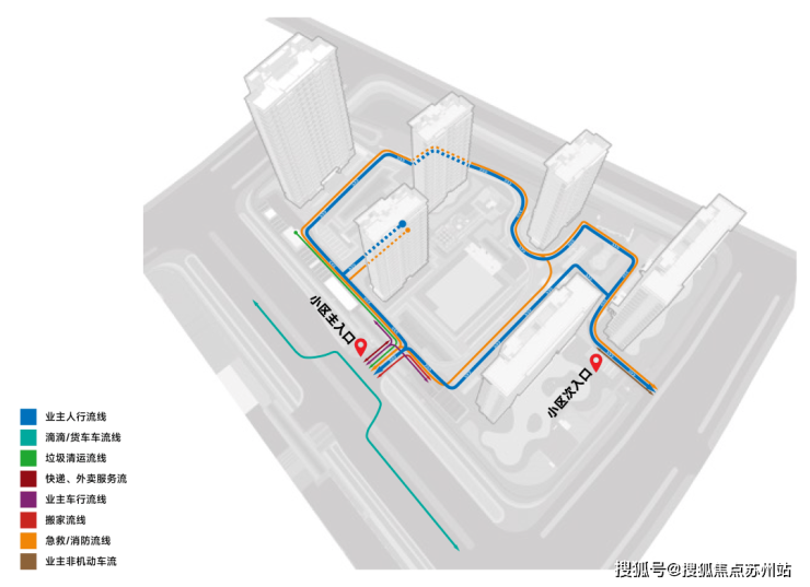 车行动线、人行动线、游园动线;人车分流系统、打造尊崇的归家仪式基于不同人群需求,多个社区动线,包括人行出入动线、车行出入动线、非机动车流线、快递外卖动线、急救/消防动线、垃圾清运动线等。