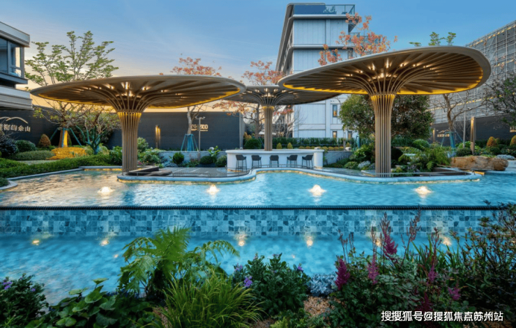 项目拥有一座约1600㎡度假酒店中岛,整个中岛内拥有海岛风层叠水池、社交客厅以及庭院架空层,共鸣多样化松弛生活场景。