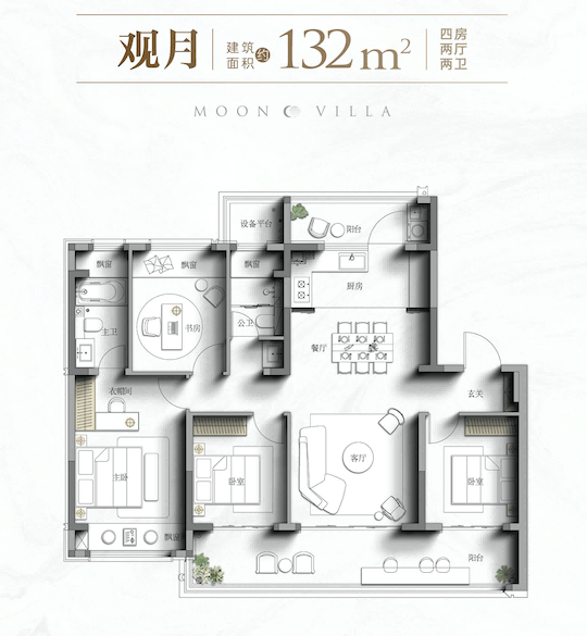建面约132㎡改善洋房:经典户型,约13.4米的大面宽,南北双阳台,还有飘窗赠送,空间感非常棒。