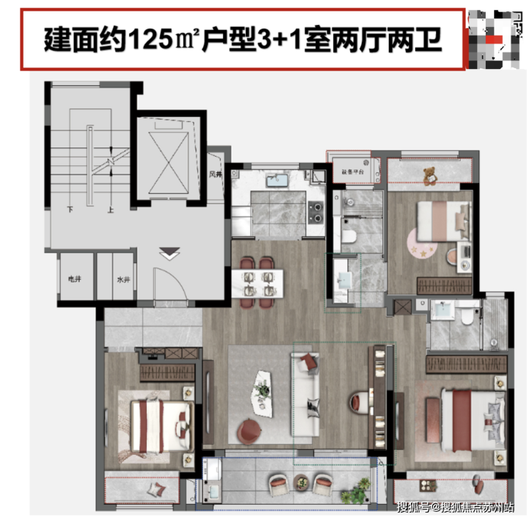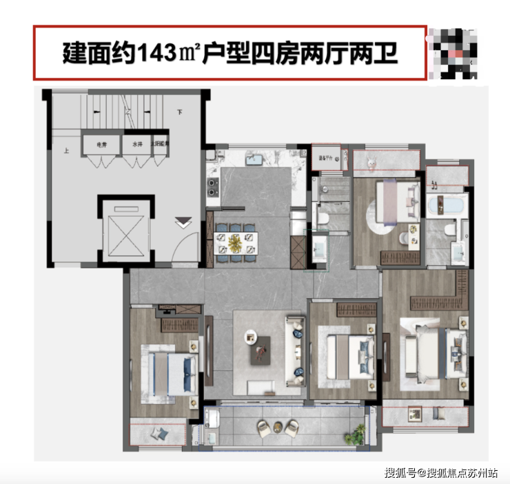 建面约143㎡户型,是125㎡户型的升级版,整体格局类似,但是在125㎡户型的基础上,每个空间都更奢阔。
