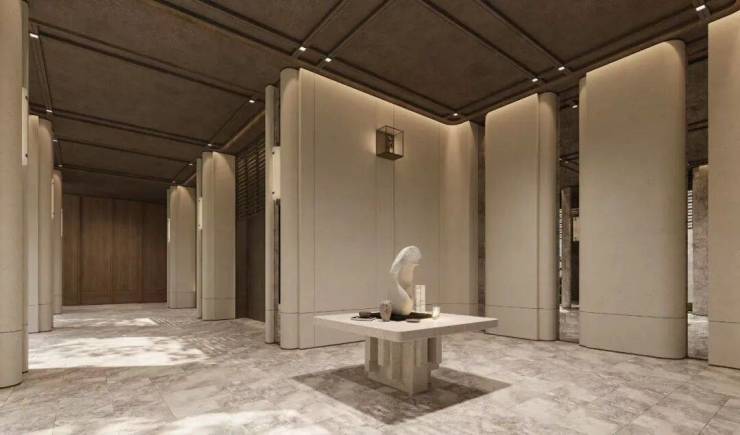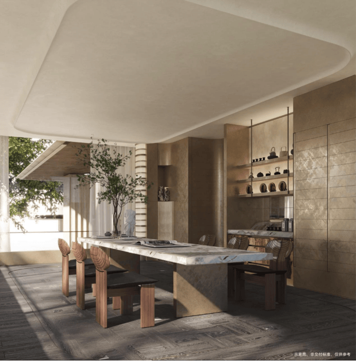 “回归之境”以3500㎡下沉水苑为核心,汇聚会客、泳池、茶室等多功能空间,形成仪式感十足的社区舞台.