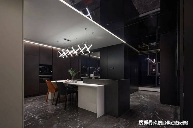 与客厅相比,餐厅对黑色的运用更为多元。设计师巧妙地运用不同材质,吊灯与精致器皿相得益彰,一幅城市墨画定格了时间,伴随着富有格调的三餐四季。