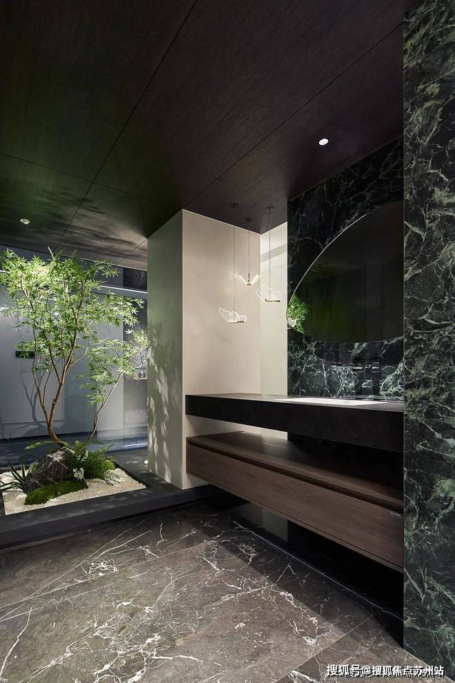 设计师采用【爱力蒙特∙黑金帝国石】地面通铺,独特的浓郁黑色底色,自带无尽视野纹理舞动地闯入,多元文化沉淀的石材,在灯光的映衬下,赋予空间奢雅而高级的气息。推动人与场域建立共鸣与自洽的美好连接。