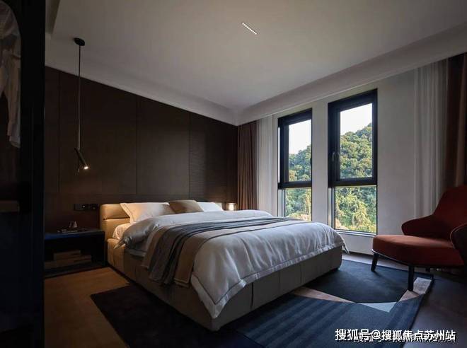 艺术感不仅体现在空间环境的营造,细节的处理和材质的选择也透漏出时尚气息。大气中又不失生活的趣味。皮质有纹理的软包,无主灯的设计,每一处细节都体现着轻奢感。地毯、床品和吊灯的相互映衬,营造出自然舒适的空间氛围,增添了卧室的温暖气息。