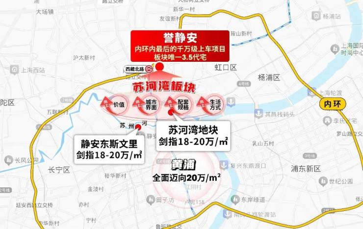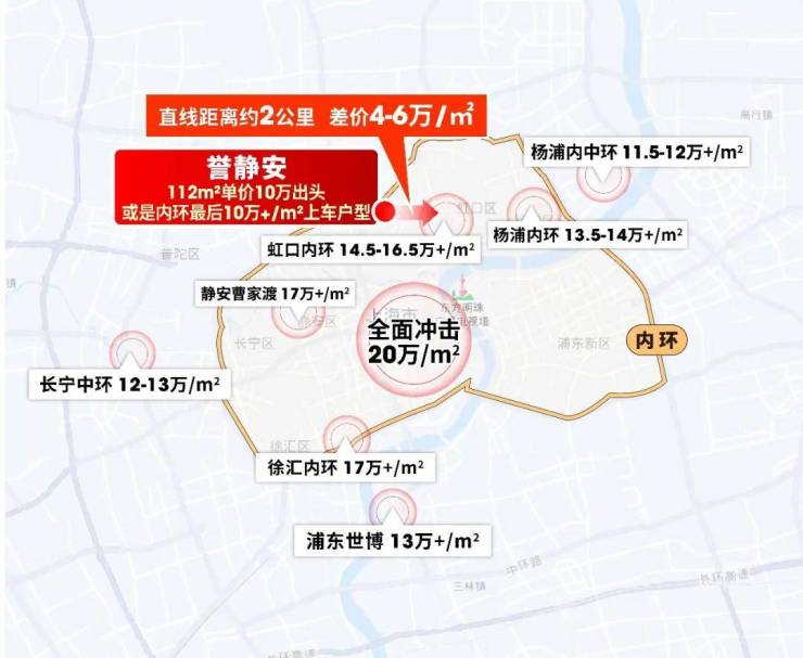 虹口内环已达14.5-16.5万/㎡,与项目直线距离仅约2公里,单价高出4-6万/㎡;