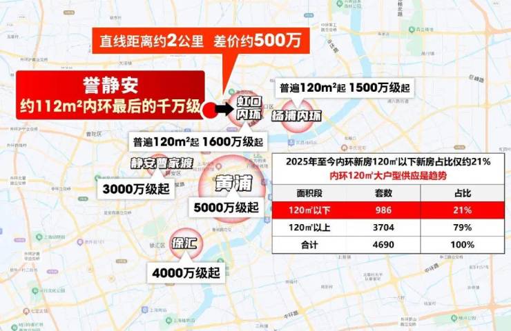而虹口、杨浦内环,到传统市中心普遍超过3-5站,通勤效率不如这里,总价门槛却比誉静安高出约500万。