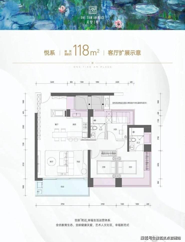 作为入门级改善户型,有3房和2房的选择,118㎡悦系在户型图中展现“客厅扩展示意”:通过拆除部分非承重墙,客厅开间从3.5米扩展至5.75米,形成约28㎡的家庭活动区,可容纳孩子玩耍、家人聚会等多场景。