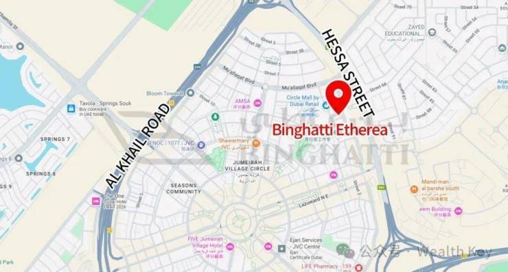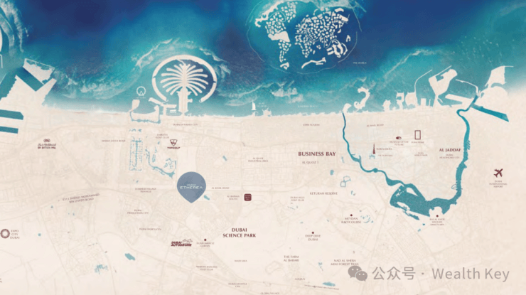 Etherea社区坐落于JumeirahVillageCircle(JVC朱美拉环村)的核心位置,这片社区始终以高品质生活体验位居迪拜房产投资的榜单前列,从这里出发,可直达城市中的30余个景观公园,与AlKhailRoadandHessaStreet无缝衔接,交通出行极为便捷。
