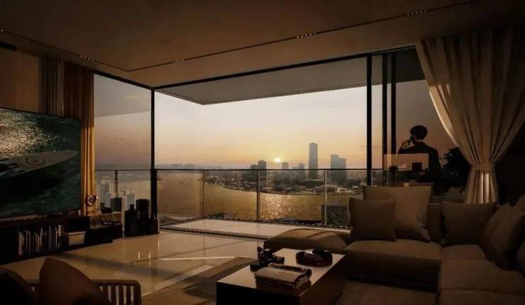 项目的滨江大户型,以无界平层结构,配合3.3米层高(部分)和全景落地窗打造270°环幕江景舱,实现上海滨江市场罕见的IMAX环幕江景视野!