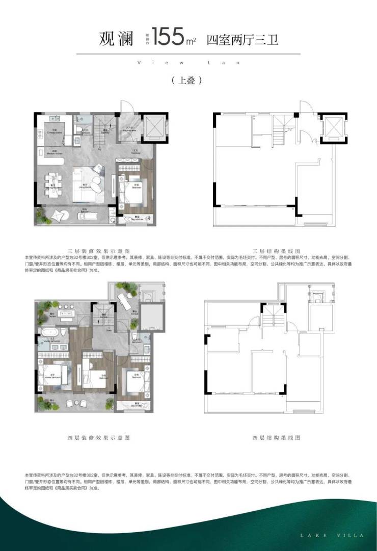 155平叠墅(四房两厅三卫) 拥有约6.75米的景观宽厅,老人房朝南,厨房空间灵活,主卧开间约3.85米,舒适度很高。