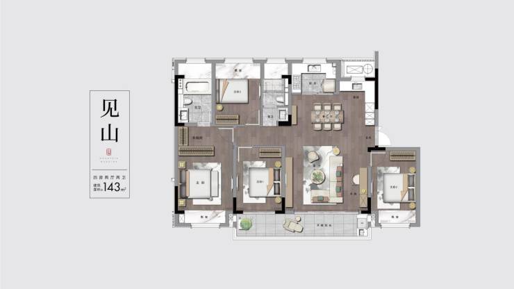 洋房约143㎡,做到了四房两厅两卫,格局方正,功能齐全。