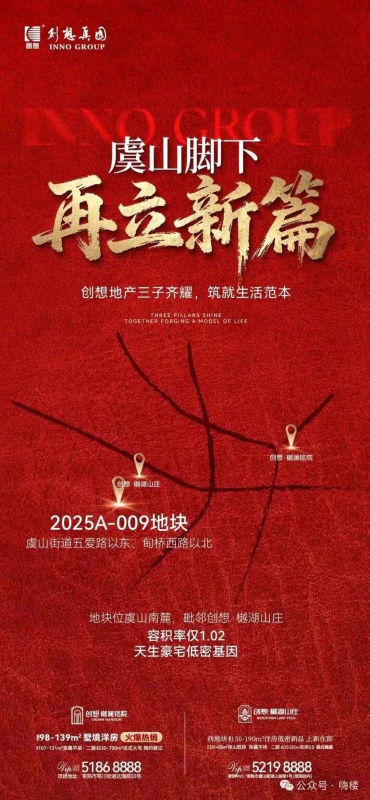 此外,创想集团在2025年11月还竞得了与樾湖山庄相邻的虞山低密地块(2025A-009,楼面价10000元/㎡,容积率1.02),未来可能与樾湖山庄合并开发,进一步巩固其在虞山高端别墅区的版图。连续精准布局核心低密地块,彰显了创想集团深耕常熟、聚焦高端改善市场的坚定战略。