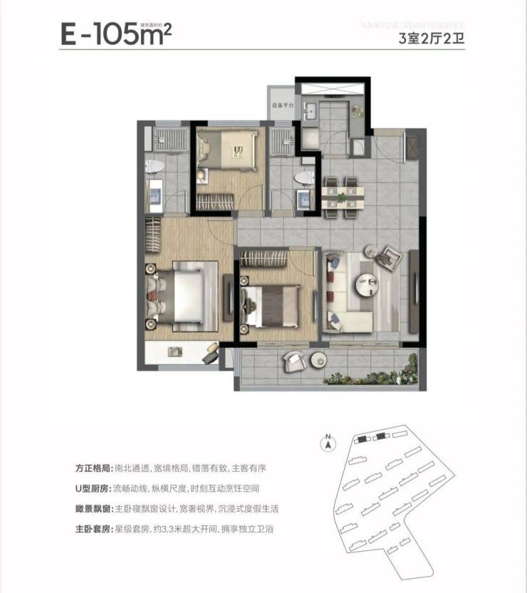 改善型客户可以重点关注这个。独立玄关前厅,一进门就有大户人家的气场。约6.9米的“寰幕横厅”,那种开阔感,真的要亲身体验才知道。U型厨房、全景飘窗、酒店式主卧套房,所有你能想到的美好,这里都给你配齐了。