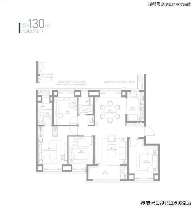 约130㎡四房,采用“飞机户型”设计,约13.5米整体面宽,拥享优秀光影与通透视野。