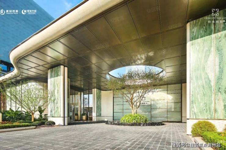 1.主入口:宽约80m、高约7m奢阔大门,用贝金米黄、维多利亚绿奢石+古铜金属板;中央植60年树龄紫薇,基座为宝格丽黑奢石;约3.2m抬高园林,归家礼序感强.