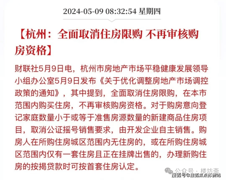 2024年5月9日,浙江杭州市发布关于优化调整房地产市场调控政策的通知。其中提到,在杭州市范围内购买住房,不再审核购房资格。意味着杭州全面取消住房限购。