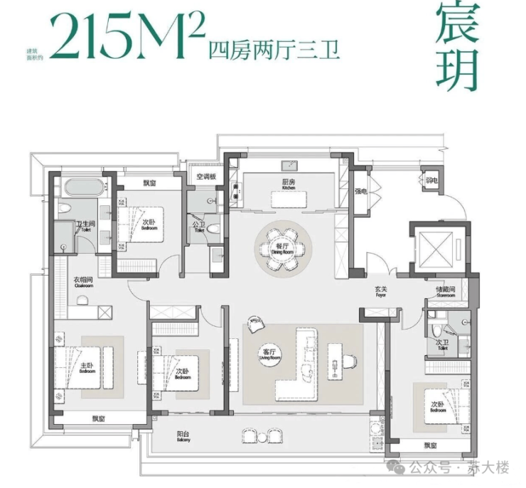 约172m²4房3卫设计,带独立入户前厅,4开间朝南,横厅开间约5.4米,客厅阳台通铺设计;2个套房,其中次卧套房开间约3.4米,主卧套房开间约3.6米。